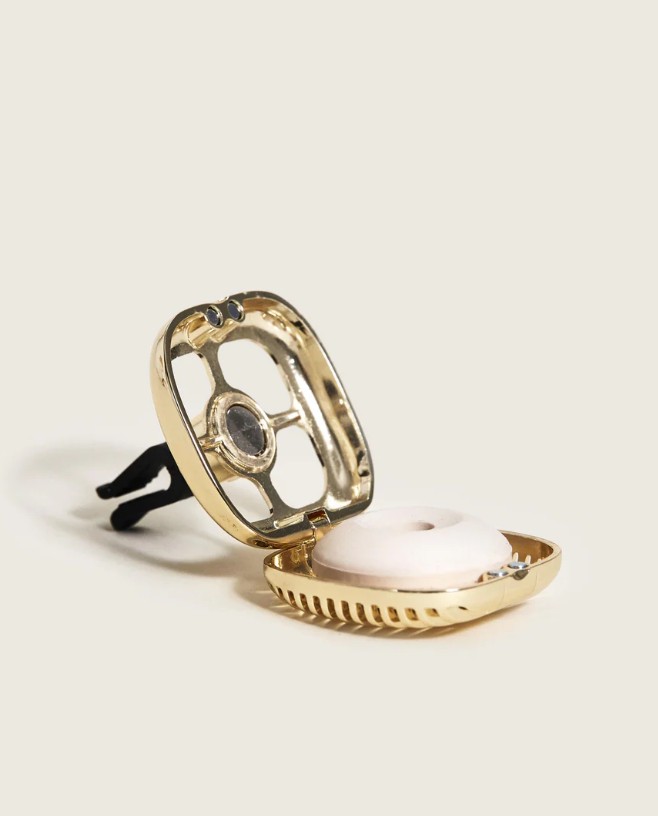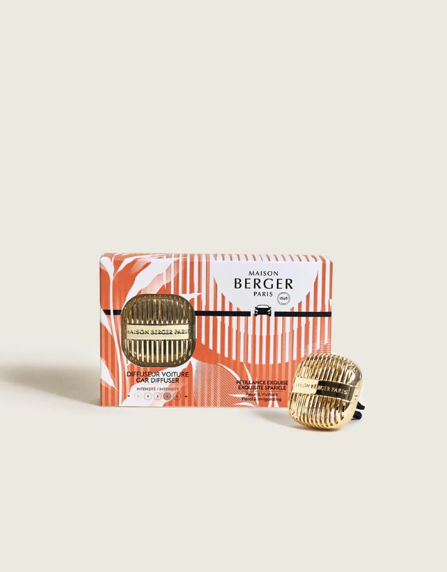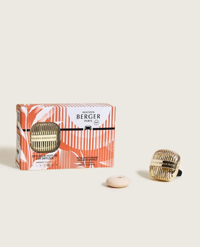 Perfume seu veículo com a sofisticação da coleção Cannelo com este difusor dourado para carros. Seu design, que ecoa os contornos das lâmpadas Berger, libera suavemente a fragrância Exquisite Sparkle, garantindo uma experiência de aroma refinada em qualquer lugar.
