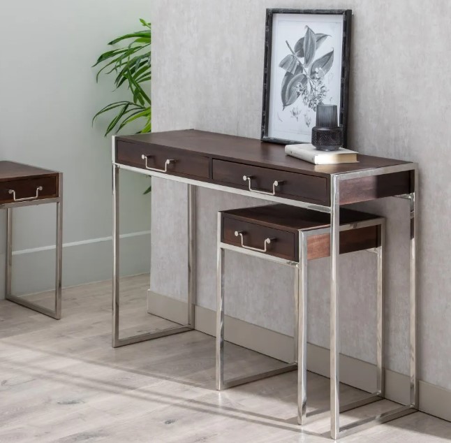 Home Mesas Mesa de Apoio Marrom - Prata -40% Mesa de Apoio Marrom - Prata 2 unidades em stock | SKU: 605587MESA 57,00 € 95,00 € Desconto de 40%. Comprar Contactar Adicionar à wishlist Mesa de Apoio de madeira marrom e prata nos pés e nos puxadores da peça . Existem em conjunto , Consola da mesma coleção . Partilhar