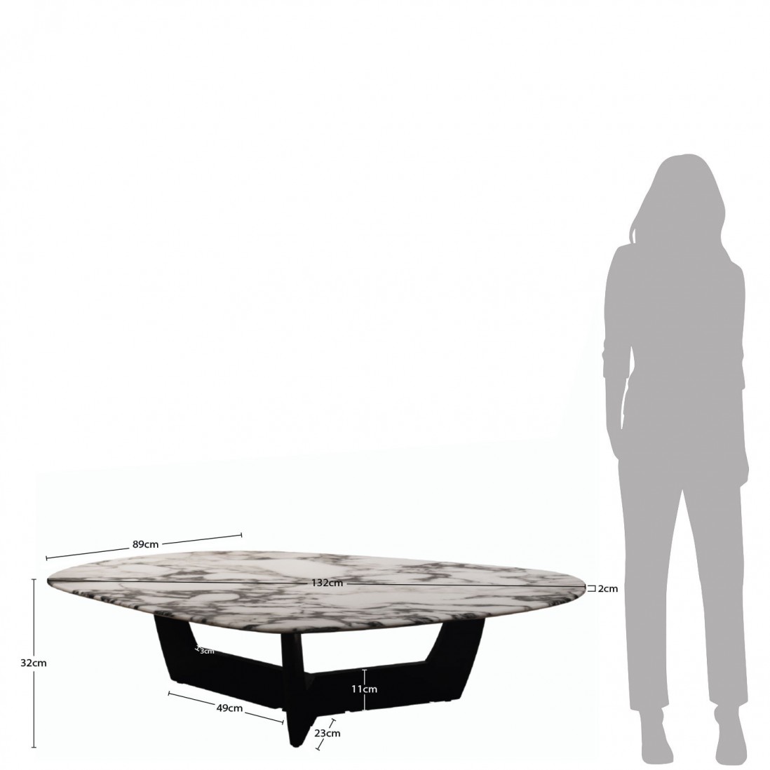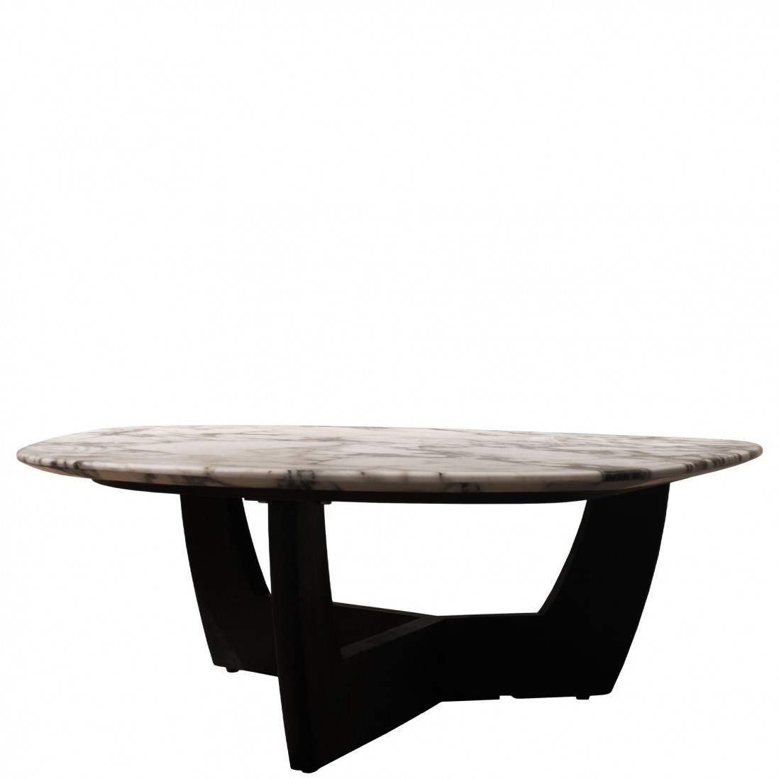 A base em madeira de ulmeiro também pintada de preto, foi desenhada para complementar o tampo, tanto em cor quanto em estilo. O design arrojado da base, com suas linhas geométricas e robustas, oferece não apenas suporte estável, mas também se destaca como um elemento de design que captura a atenção e realça a beleza do tampo.