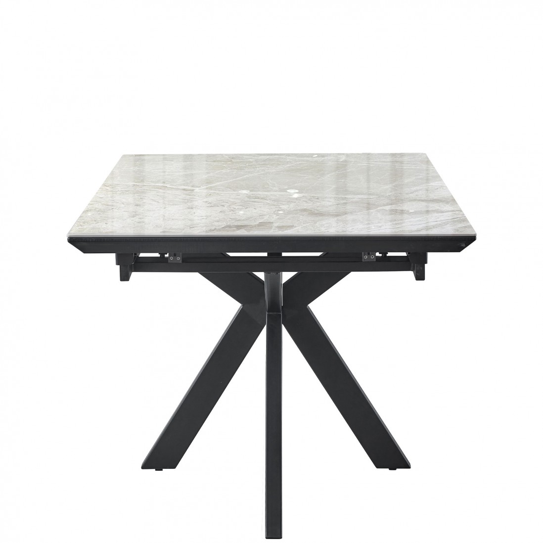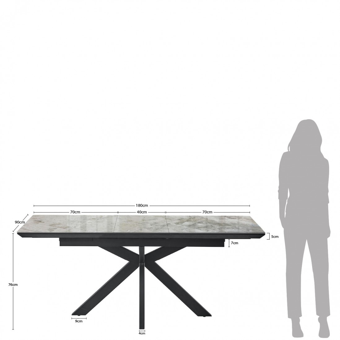 O detalhe dos pés em metal lacado preto acrescenta um toque moderno e minimalista à mesa, conferindo-lhe uma base robusta e estável, enquanto o design em forma de cruz proporciona um visual arrojado e único. Esta estrutura não só garante firmeza, como também maximiza o espaço para as pernas, oferecendo conforto aos seus convidados. O mecanismo extensível é discreto e fácil de manusear, permitindo que adapte a mesa às suas necessidades com um simples movimento, sendo que inclui um travão para cada uma das posições, fornecendo maior segurança e estabilidade.