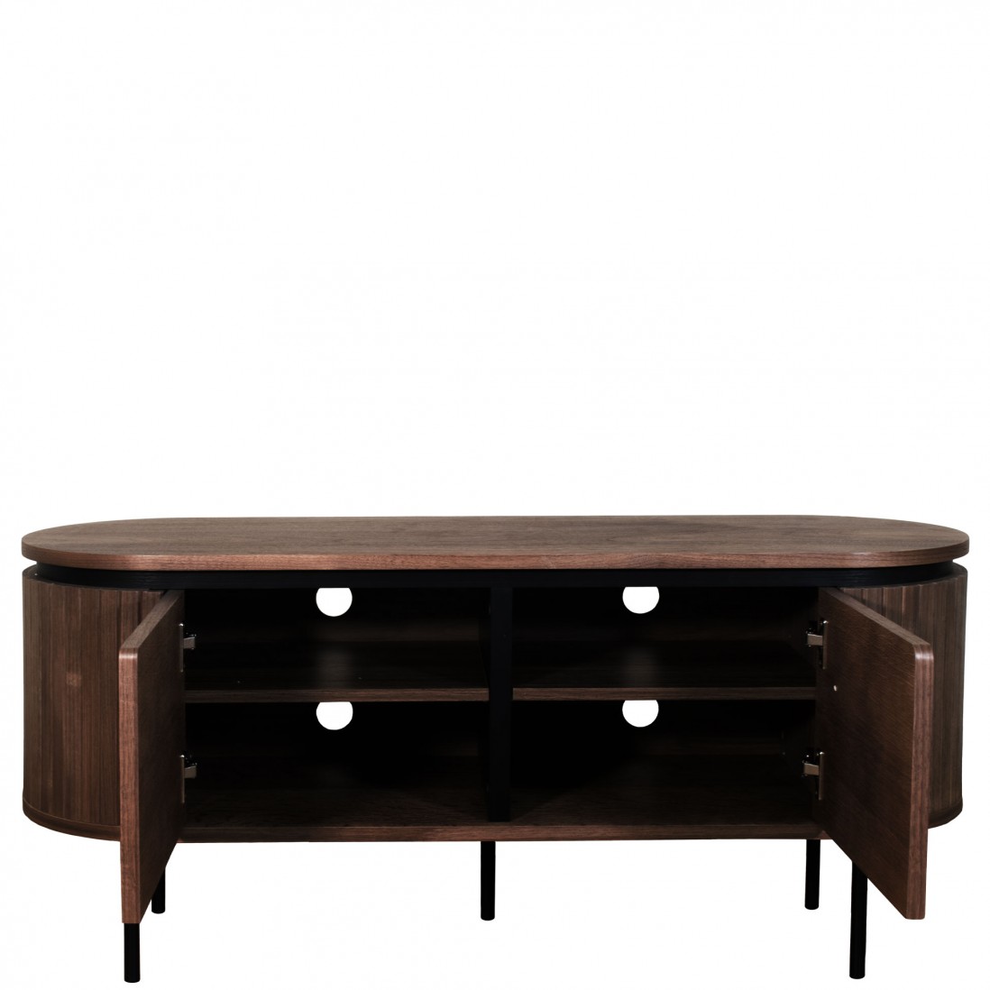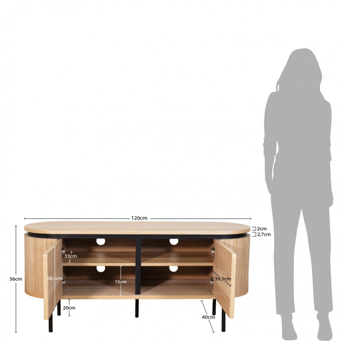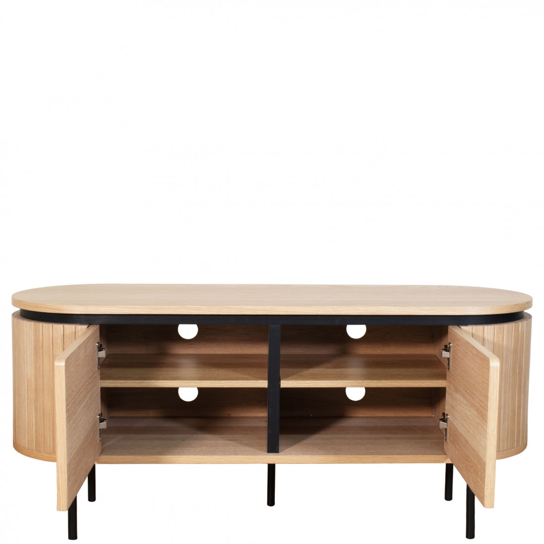 As pernas em metal preto, finas e discretas, elevam ligeiramente o móvel, conferindo-lhe uma aparência leve e moderna. No interior, o móvel é equipado com prateleiras ajustáveis em altura, proporcionando flexibilidade para armazenar diversos equipamentos multimédia e objetos decorativos. Os acabamentos laterais em madeira apresentam linhas verticais texturizadas, criando um efeito visual dinâmico que contrasta com a superfície lisa das portas.