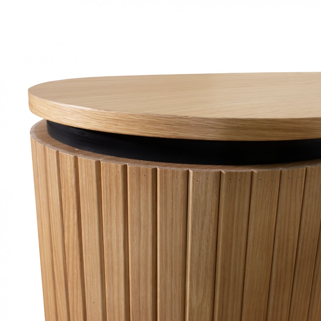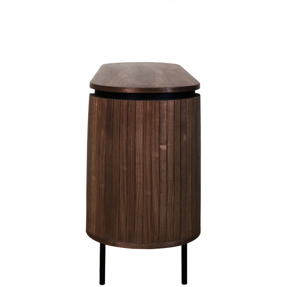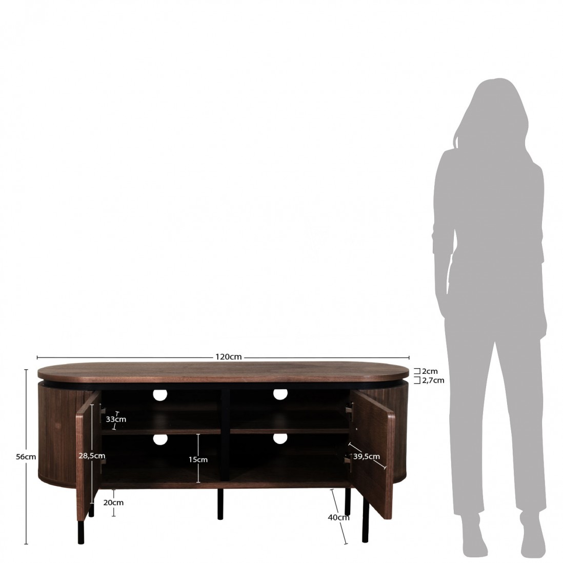 As pernas em metal preto, finas e discretas, elevam ligeiramente o móvel, conferindo-lhe uma aparência leve e moderna. No interior, o móvel é equipado com prateleiras ajustáveis em altura, proporcionando flexibilidade para armazenar diversos equipamentos multimédia e objetos decorativos. Os acabamentos laterais em madeira apresentam linhas verticais texturizadas, criando um efeito visual dinâmico que contrasta com a superfície lisa das portas.