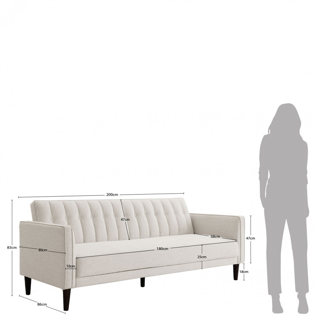 Sofá: 200 cm x 86 cm x 83 cm x 59 cm x 47 cm ( Comprimento x Profundidade x Altura x Largura do assento x Altura da almofada das costas)