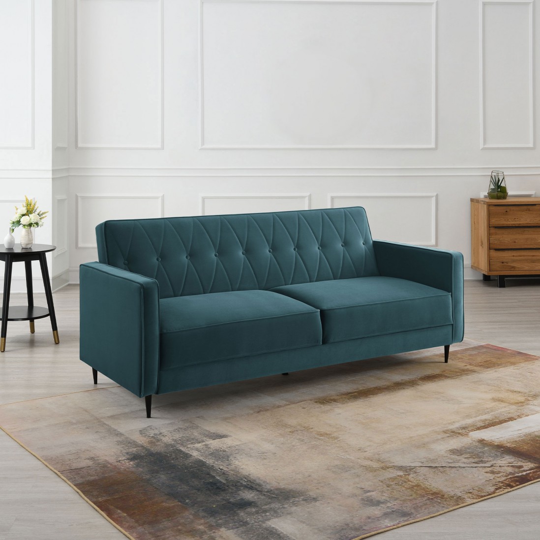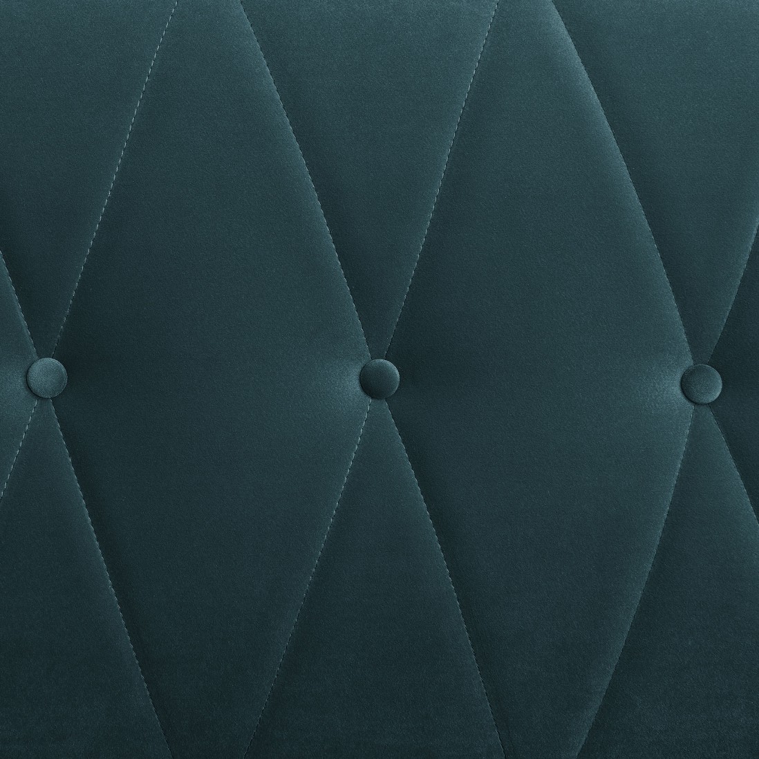A funcionalidade estende-se ao detalhe cuidado dos botões encapados que ornamentam o encosto, criando um padrão geométrico que não só adiciona profundidade ao design, mas também reforça a sua estética sofisticada. As pernas em metal lacado preto são robustas e conferem uma estabilidade impecável, ao mesmo tempo que contrastam de forma elegante com o veludo, destacando o sofá como peça central em qualquer sala.