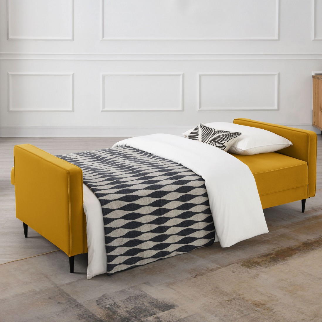 As suas dimensões generosas proporcionam espaço suficiente para relaxar, enquanto o seu mecanismo "click clack" permite uma transformação rápida e fácil em cama, ideal para acomodar visitas de última hora.